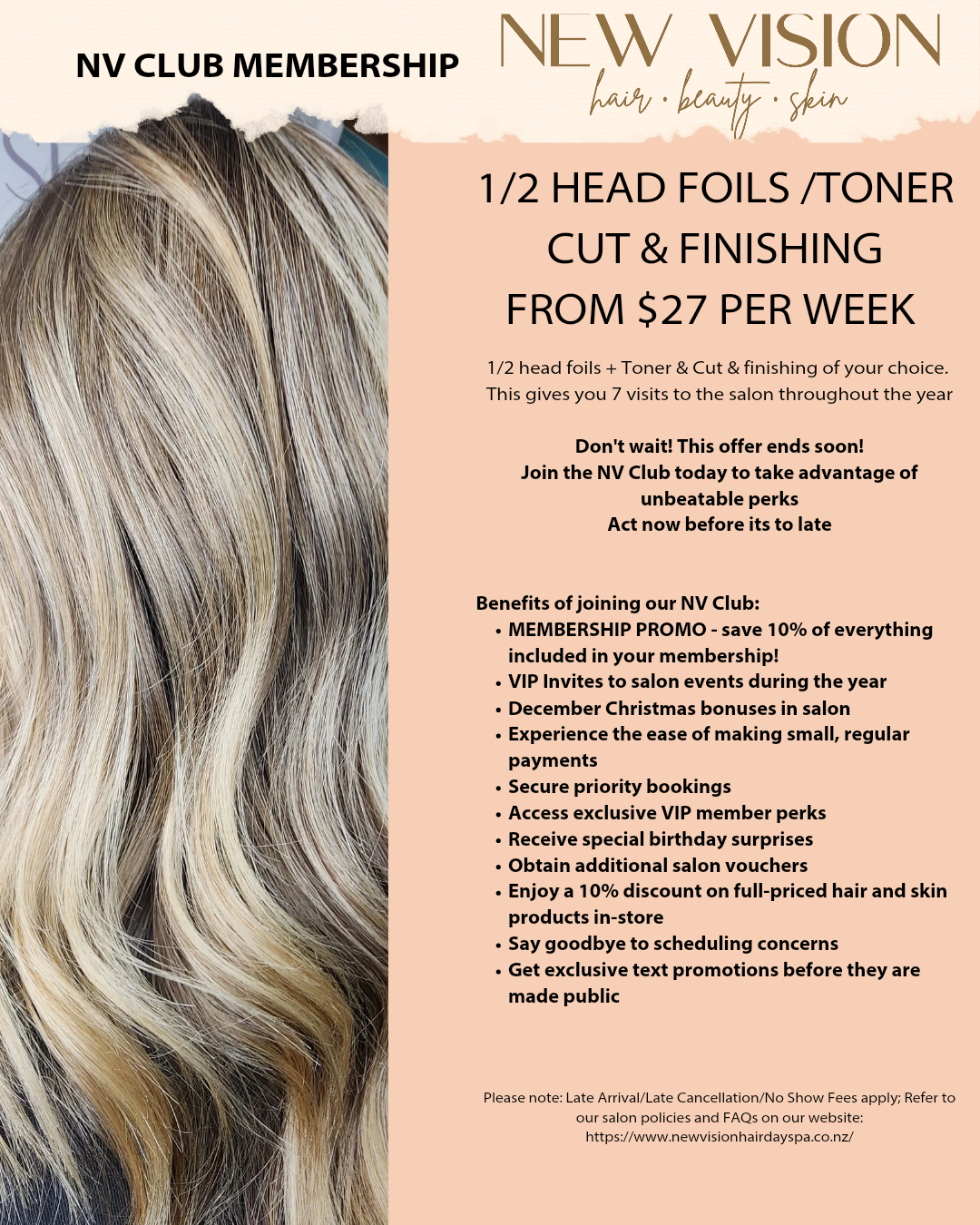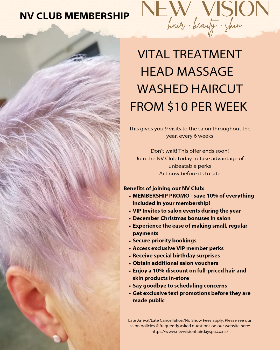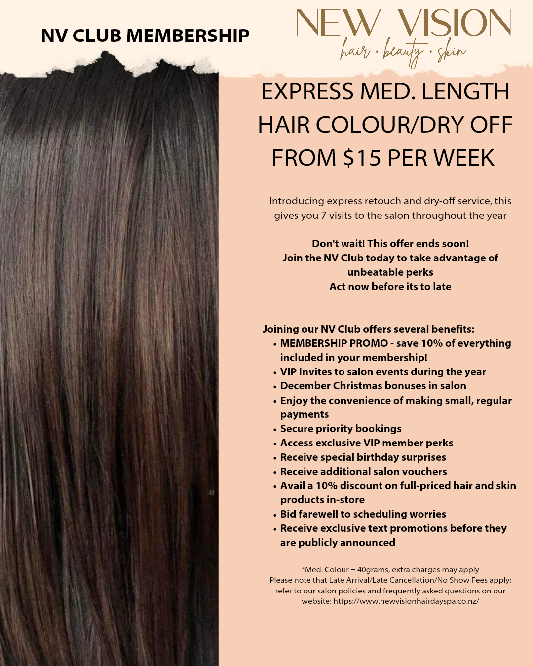 By becoming a member of New Vision Hair & Day Spa, you get easy-to-follow, pre-planned appointments at the time and on the day that best suits you, easy and affordable weekly payments, and exclusive NV Club Packages perks! Treat yourself without worrying about the bill at the end of a visit.