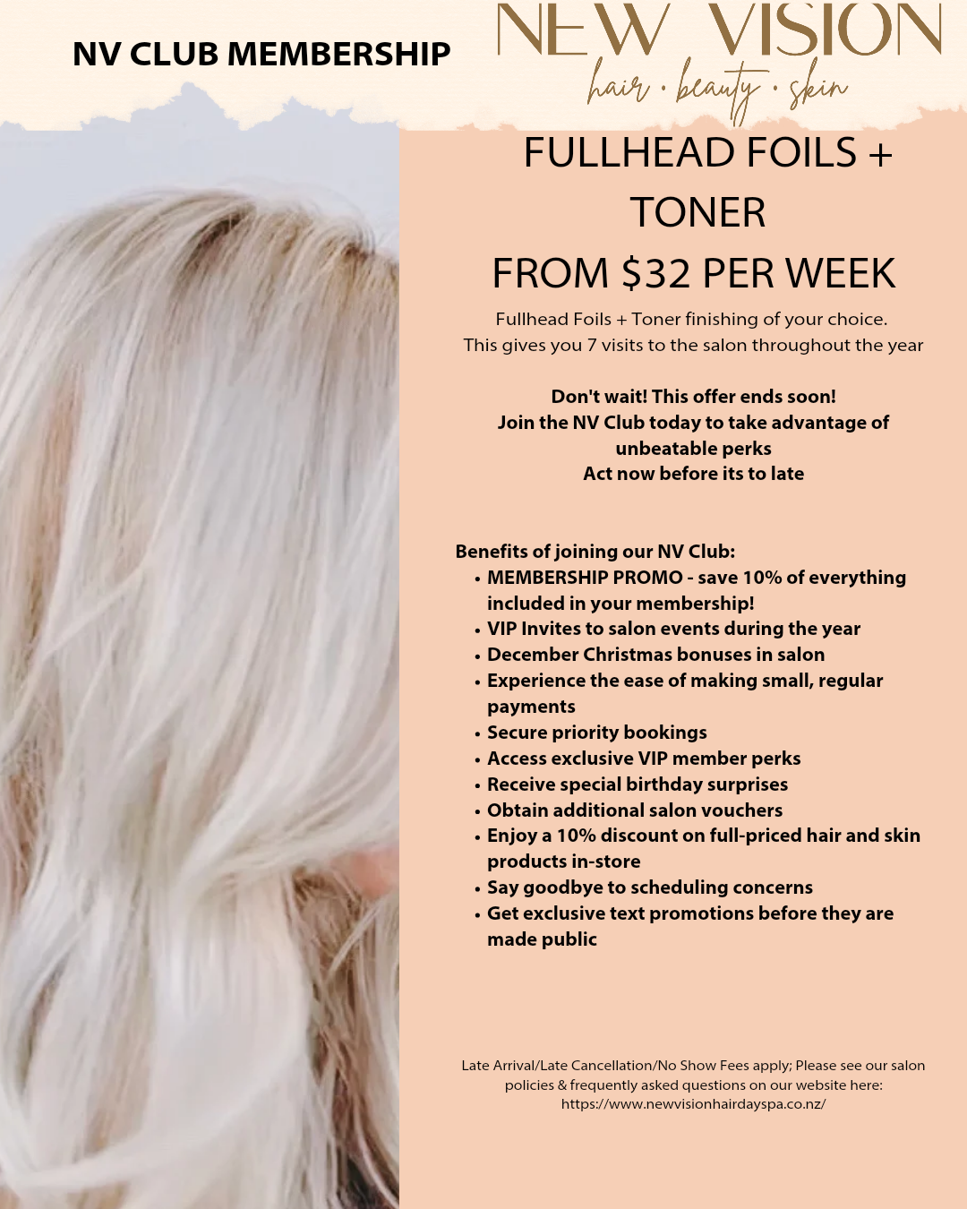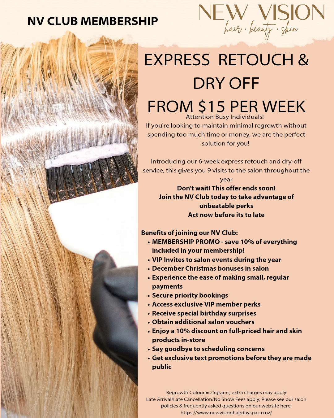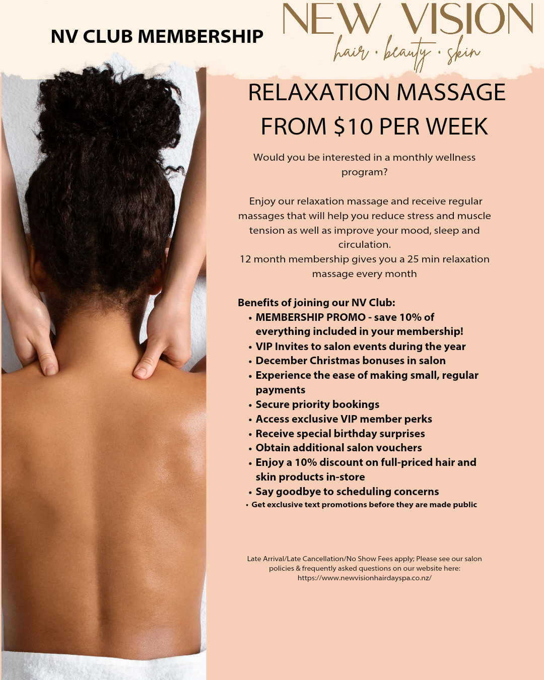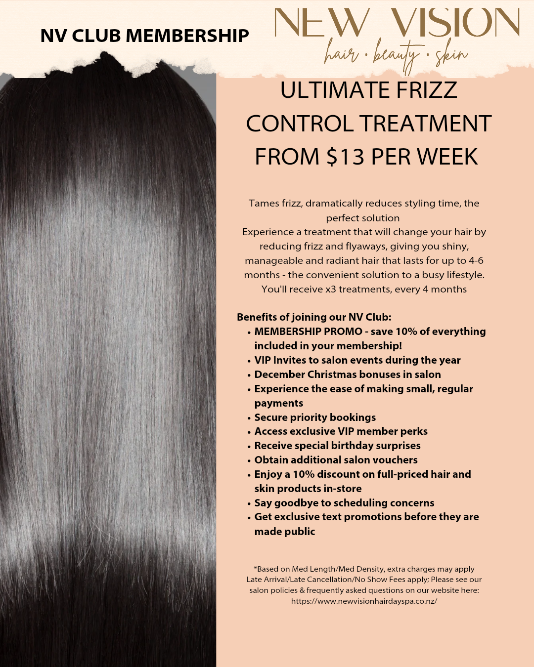 By becoming a member of New Vision Hair & Day Spa, you get easy-to-follow, pre-planned appointments at the time and on the day that best suits you, easy and affordable weekly payments, and exclusive NV Club Packages perks! Treat yourself without worrying about the bill at the end of a visit.